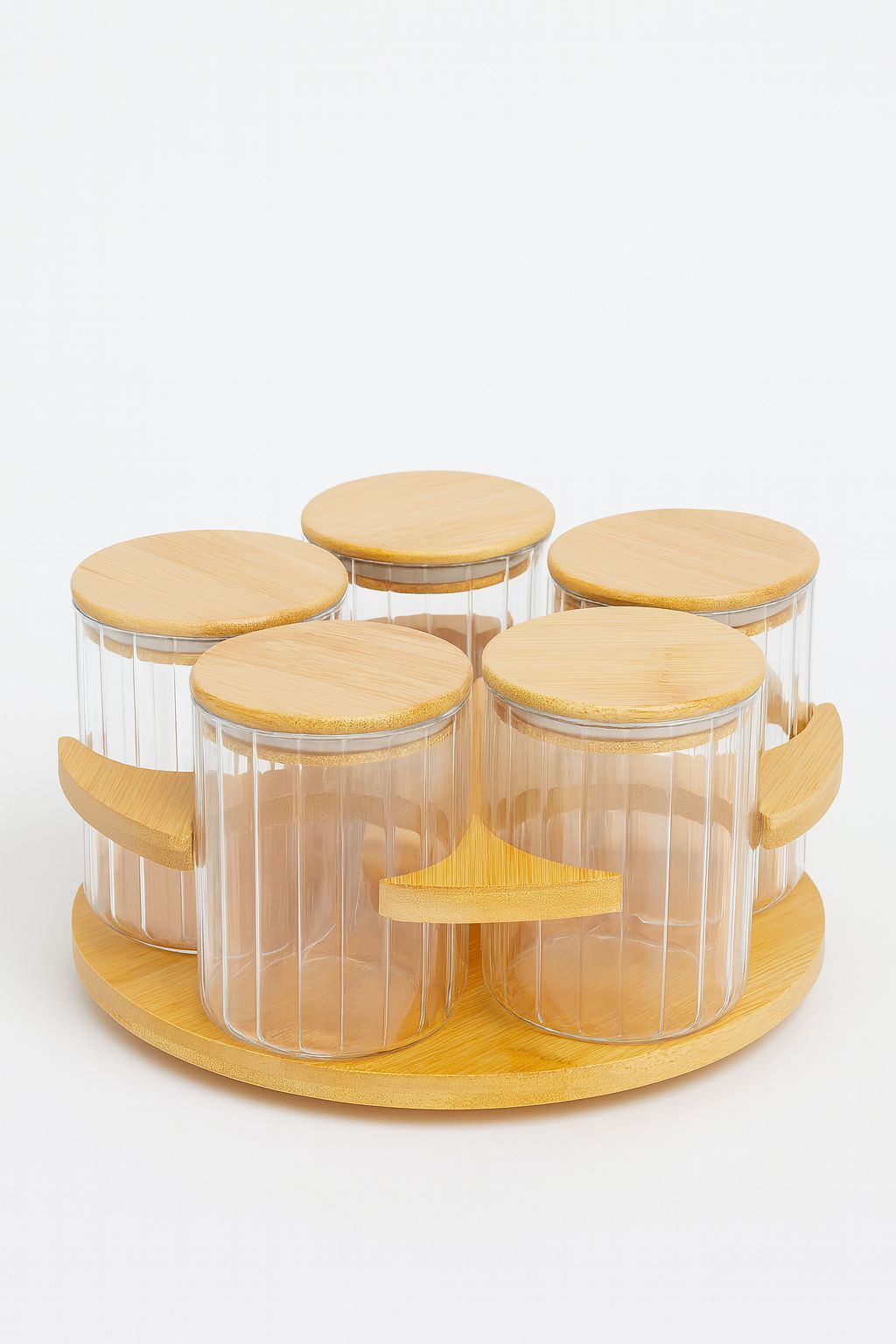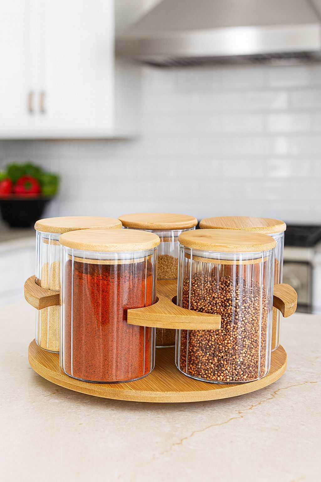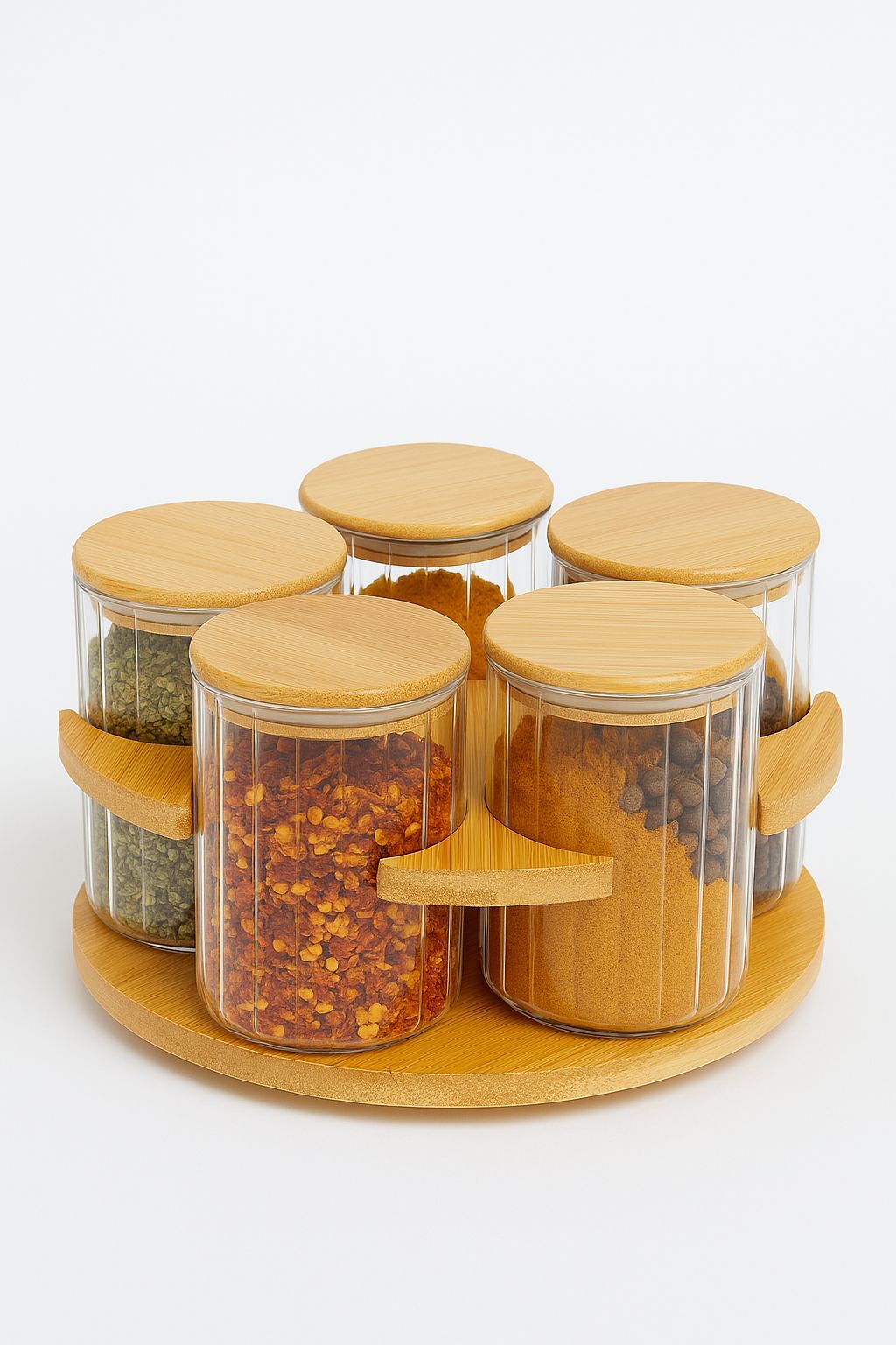 ENYAZA(2024) 5'Li Bambu Dönen Stantlı Yuvarlak Cam Baharatlık Seti Baharat Kaşıklı Çeyiz Ve Mutfak Seti 400 Ml